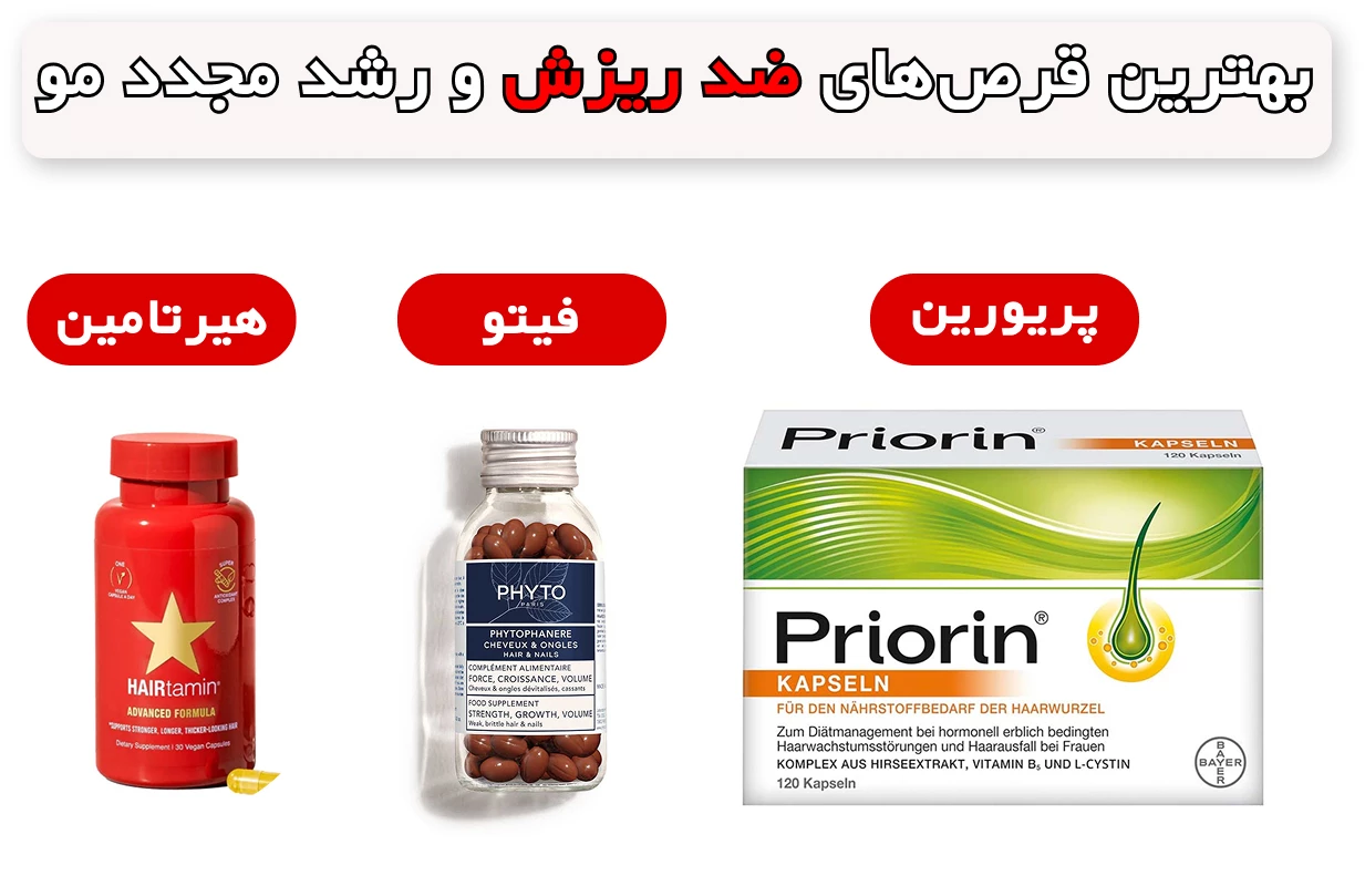 قرص فیتو یک محصول گیاهی است که بخصوص به بهبود ریزش موی ارثی کمک میکند. قرصهای هیرویت و هیرتامین سرشار از ویتامینهای ضروری برای مو هستند. و قرص پرپورین حاوی عصاره گندم و بیوتین بوده و برای موهای نازک و ضعیف شده مناسب است.